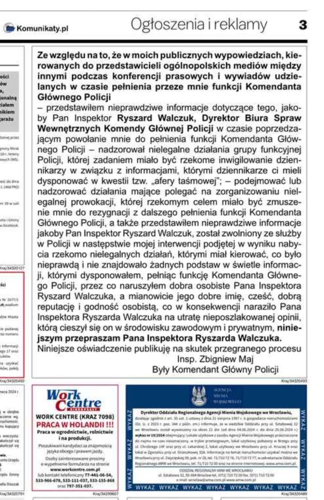 Zgodnie w ww. wyrokiem Sądu, tej samej treści przeprosiny insp. Zbigniew Maj zobowiązany jest zamieścić na 3 stronie miesięcznika „Policja 997”.
